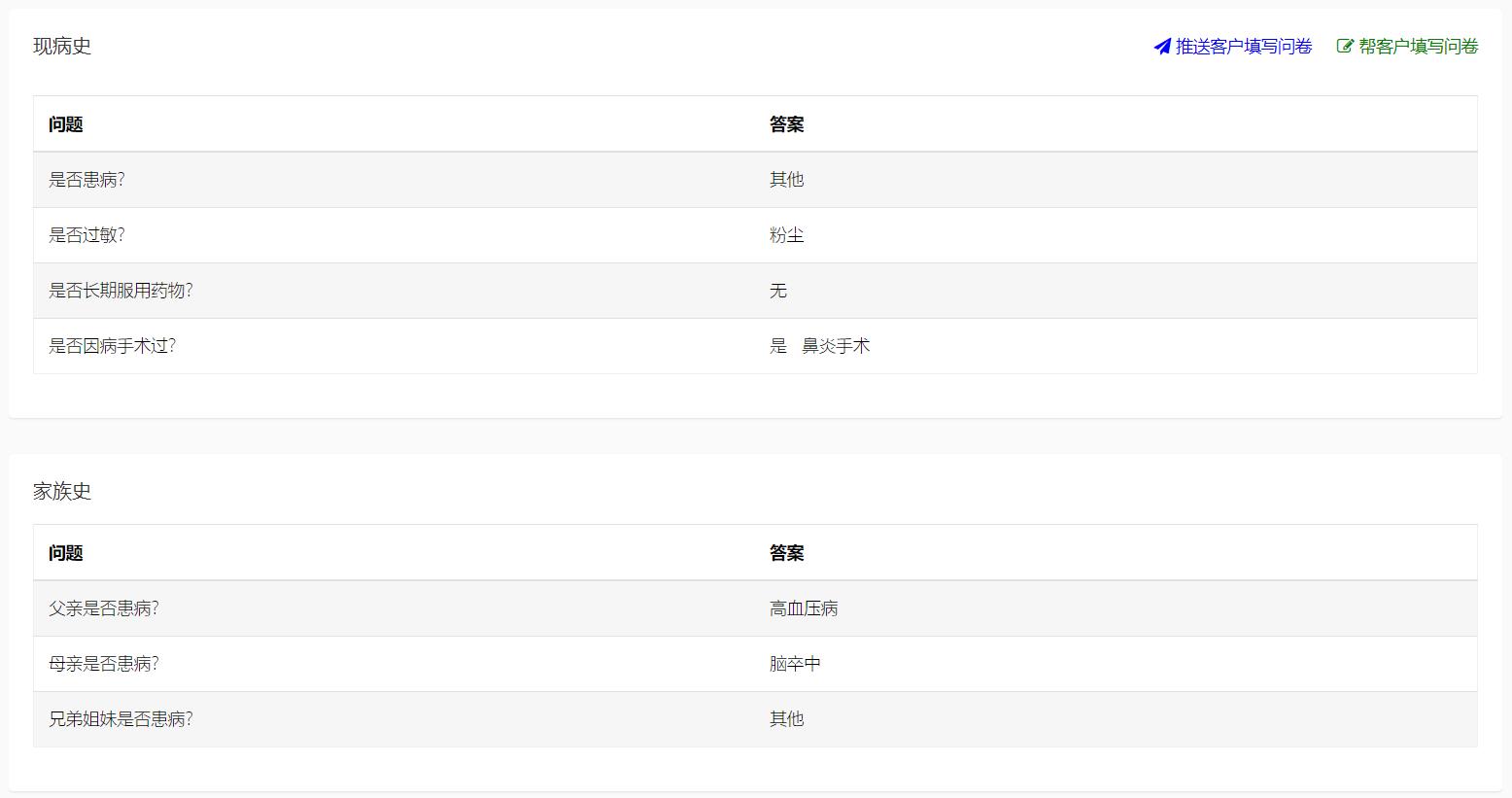 新开卡的客户,需要填写检前问卷。可由健管师帮客户填写,也可客户自己在商家 公众号填写检前问卷。